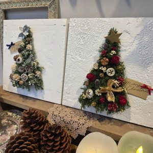 漆喰調に仕上げた木製ボードにプリザーブドグリーンで作ったツリーをあしらい、木の実やオーナメントを飾ります。玄関やリビングに飾れるサイズ感が人気です。