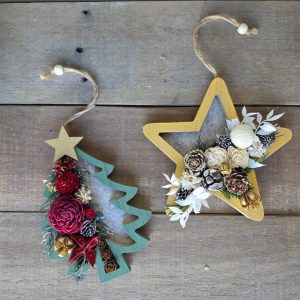 ツリー型や星型に、木の実やソラフラワーをアレンジした可愛いオーナメント。クリスマスの雰囲気を引き立てるアイテムとしてピッタリです。小さなお子様でもアレンジできます!サイズ:ツリー11.5×1.2×15㎝ 星:15×1.2×15㎝