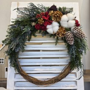 プリザーブド加工された深みのあるの針葉樹とトウヒ使用し、クリスマスらしいリースに仕上げています。