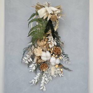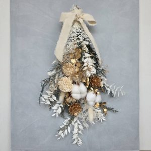 ホワイトとゴールドの色合いを基調とした、スワッグです。コットンフラワーや松ぼっくり、木の実をあしらい、ナチュラルな雰囲気でありながら、ゴールドのアクセントが華やかさと上品さを加えています。お正月には、水引、しめ縄、縁起物の蓮の実や松をプラスアレンジすることで長く楽しめる2wayタイプです。
