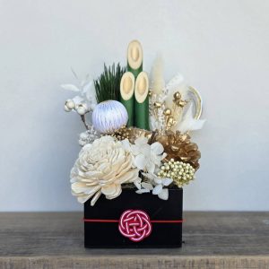竹松の縁起の良い素材を使った、華やかな門松。金のアクセントや和風の飾り玉が、お正月気分をぐっと盛り上げます。コンパクトサイズで飾りやすく、和モダンな雰囲気がインテリアになじみます。